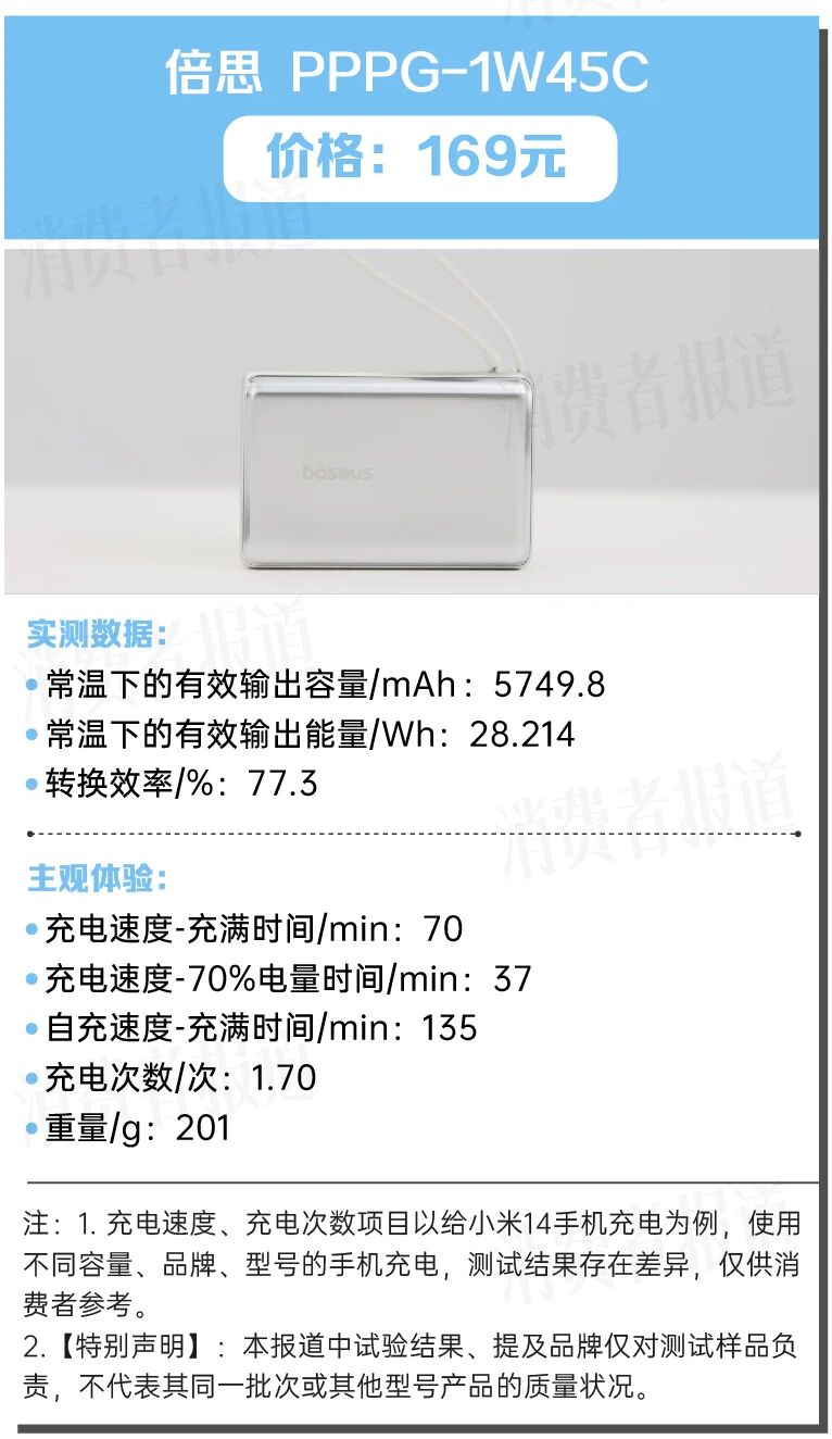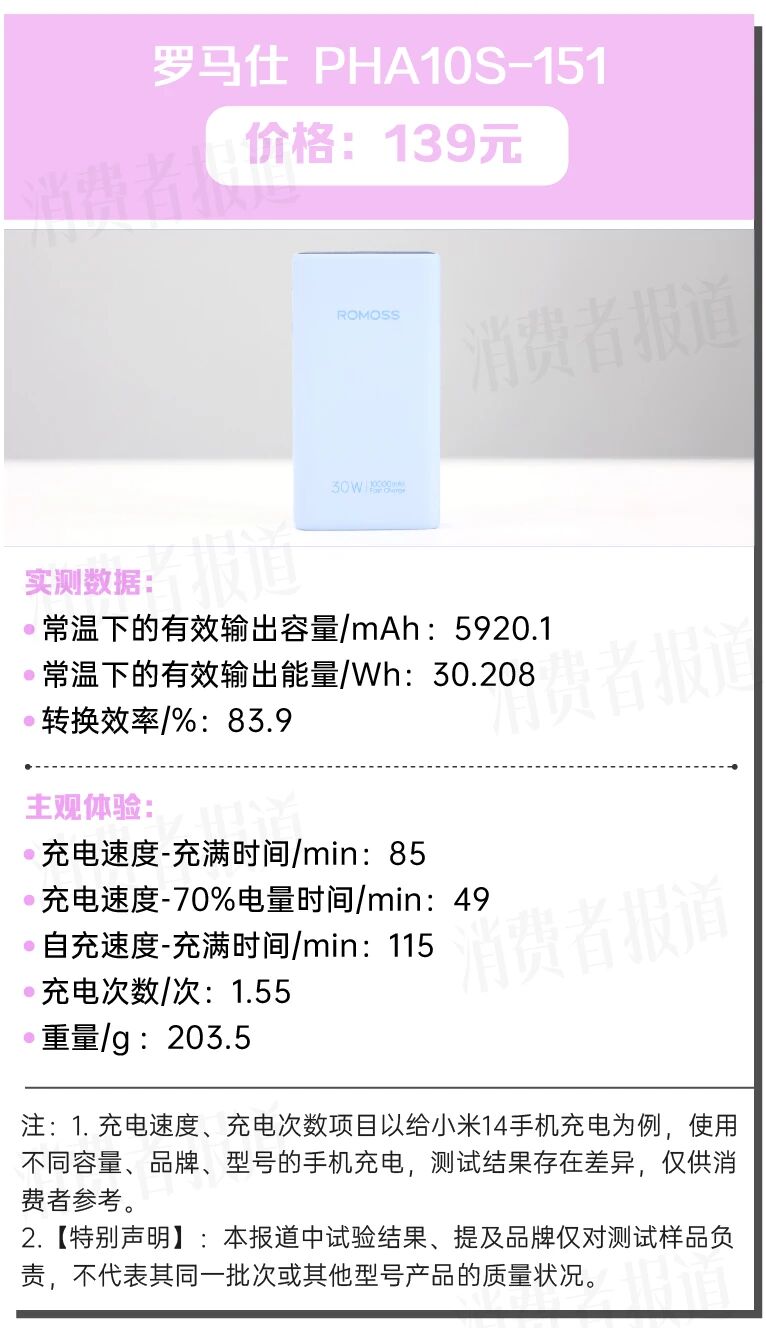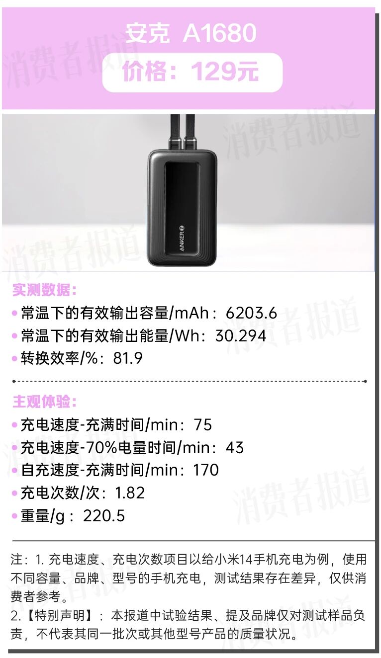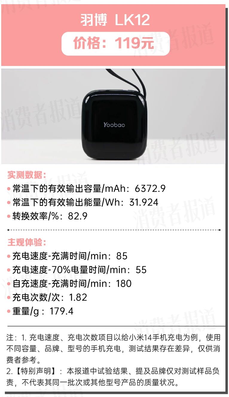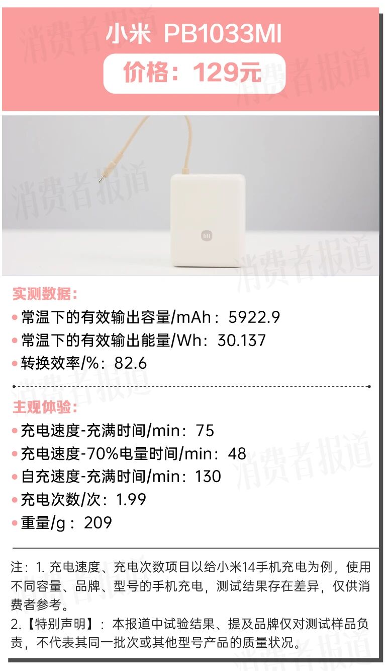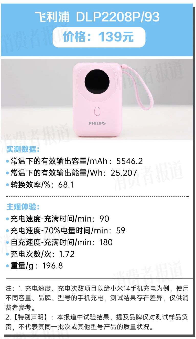 又逢“双十一”档期,针对消费者的使用痛点,《消费者报道》对7款热销移动电源进行了实测。品牌及产品型号包括小米PB1033MI、罗马仕PHA10S-151、倍思PPPG-1W45C、品胜TS-D364、安克A1680、飞利浦DLP2208P/93、羽博 LK12。